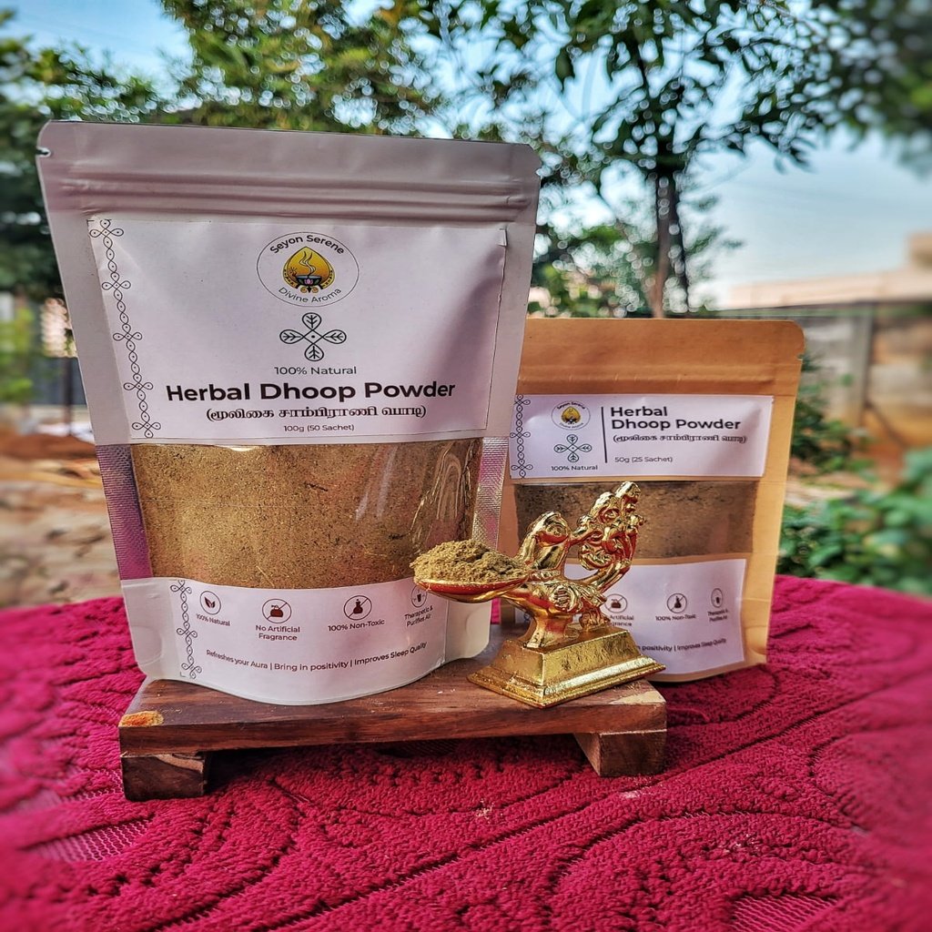 Experience the divine essence of ancient wellness with Seyon Serene Herbal Dhoop Powder, a soulful blend of 100% natural Ayurvedic herbs and resins crafted to purify your surroundings and elevate your spiritual space.